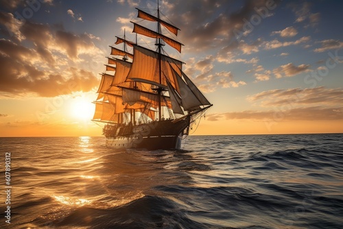 majestic clipper ship sailing on calm sea, with billowing sails and sun setting in the background, created with generative ai