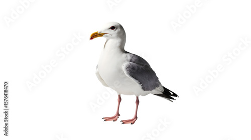 Majestic coastal seabird, a common gull with striking grey and white feathers, captured in a full-body profile view, isolated on a plain white background