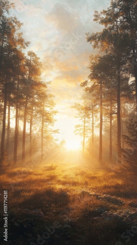 Majestic crimson sunset over forest trees nature landscape tranquil evening atmosphere serene viewpoint