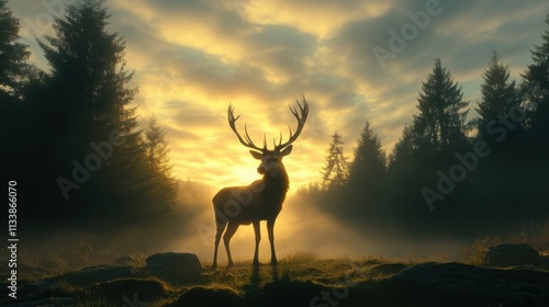 Majestic deer observing sunrise in misty forest nature photography tranquil environment scenic viewpoint