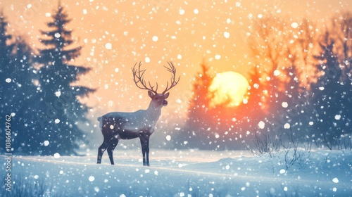 Majestic deer standing in a snowy forest at sunset with falling snow.