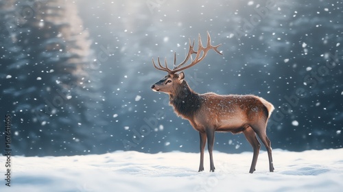 Majestic Deer Standing in Snowy Forest During Winter Wonderland Scene