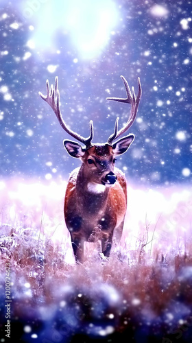 Majestic Deer Stands in Snowy Winter Wonderland with Frosty Antlers
