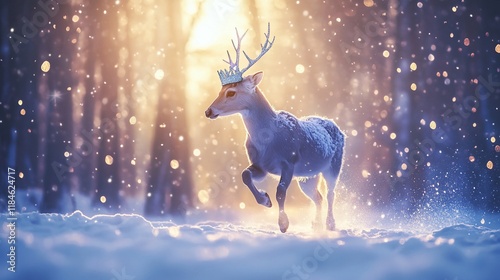 Majestic deer with crown runs through snowy winter forest at sunset.