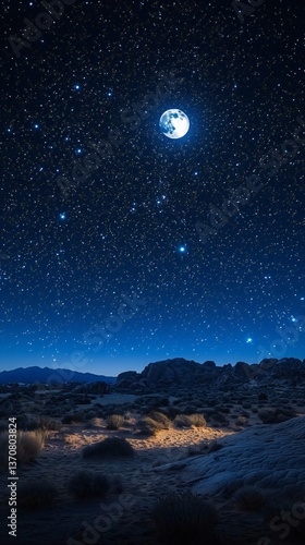 Majestic desert landscape at night under a brilliant full moon and starlit sky A breathtaking view of nature's beauty