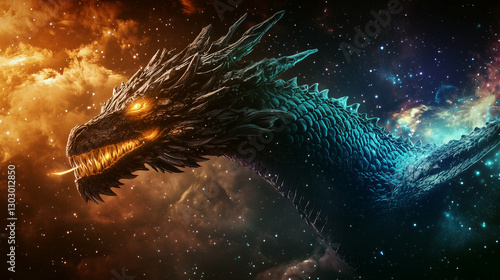 Majestic dragon from mythology and fantasy amid space, cosmos, star, nebula, galaxy, fire