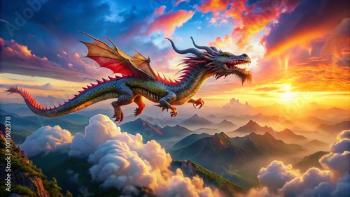 Majestic Dragon Soaring Through a Vibrant Sky with Clouds and a Glimpse of Distant Mountains