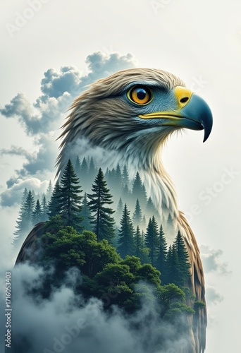 Majestic Eagle with Forest Landscape, Dreamy Clouds, and Surreal Nature Elements, Symbolizing Freedom and Wilderness in a Vivid Artistic Representation