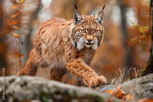 Majestic Eurasian Lynx Walking in Autumn Forest with Vivid Foliage