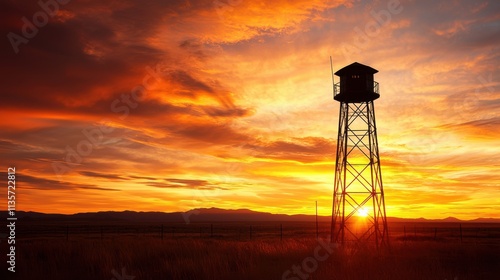 Majestic Fire-watch Tower Silhouetted at Golden Sunset with Sharp Lines and Dramatic Shadows