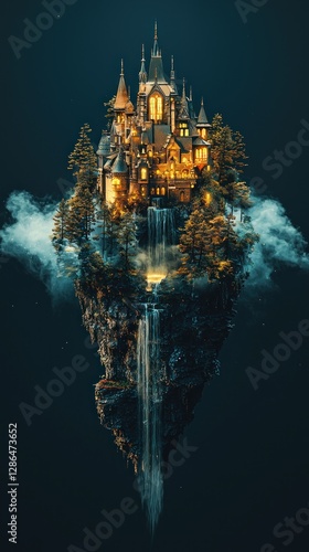Majestic Floating Castle with Waterfall and Trees in a Mystical Setting
