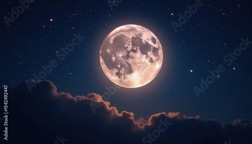 Majestic full moon radiates light against a backdrop of countless twinkling stars , heavenly bodies, bright, glimmer