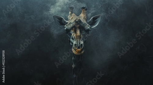 Majestic giraffe stands tall in dark misty background during evening hours
