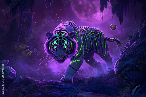 Majestic glowing tiger prowling through a mystical forest under a vibrant purple moon