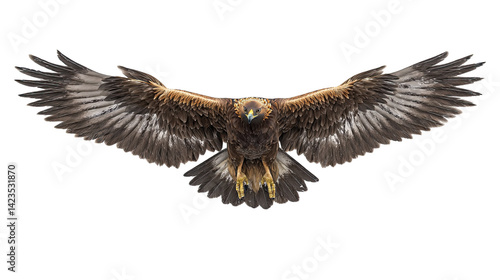 majestic golden eagle in mid-flight, wings spread wide, powerful talons, dramatic lighting, centered composition, clean