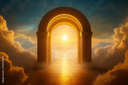 Majestic golden gateway emerging from clouds at sunset illuminates the sky with vibrant colors