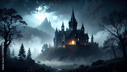 Majestic gothic castle surrounded by misty mountains at night, illuminated by eerie glowing lights.