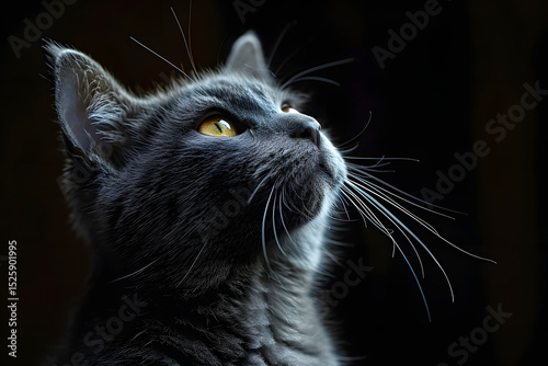 Majestic gray cat gazing upwards in soft light during quiet evening hours