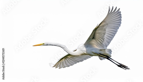 Majestic Great Egret in Flight Against a Minimalist White Background, Displaying Grace and Poise Amidst the Open Sky, Evoking a Sense of Serenity and Elegance.