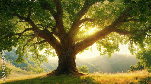 Majestic Green Canopy with Sunlight Piercing Through - A Serene Symphony of Nature's Light and Shadows, Creating a Peaceful Oasis Beneath the Verdant Leaves.