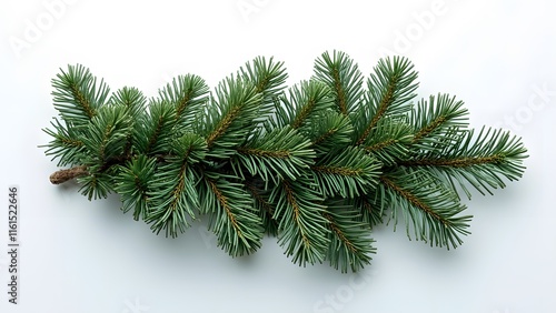 Majestic Green Fir Branch, Top View of Symmetrical Spruce Needles with Intricate Texture and Color Gradations on White Background - Christmas, Holiday, Nature