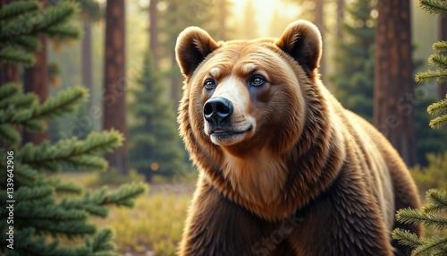 Majestic grizzly bear standing peacefully among tall pines, warm sunlight filtering through branches