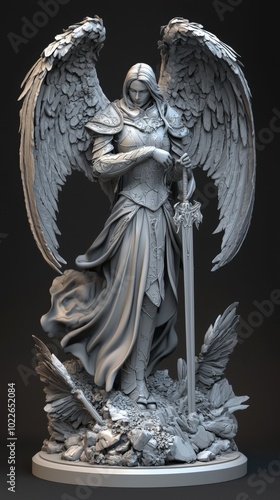 Majestic guardian angel statue stands vigil over nature, adorned in intricate armor design