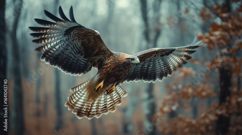 Majestic hawk soaring through autumn forest