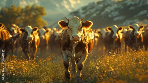 Majestic Herd: Cows Grazing in Golden Meadow