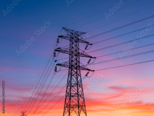Majestic High Voltage Power Transmission Tower Silhouette Against a Vibrant Sunset Sky