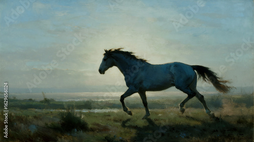 Majestic horse galloping freely across a misty meadow at dawn