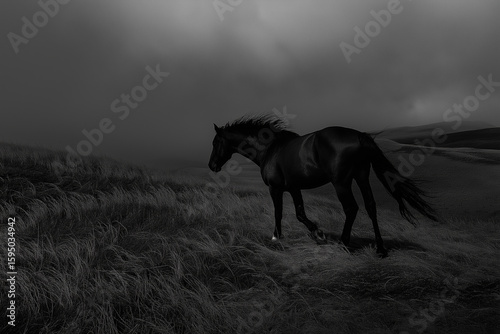 Majestic horse with dark mane galloping across a grassy field in a beautiful natural landscape