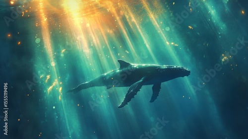Majestic humpback whale swims in sunlit ocean depths, surrounded by shimmering particles.