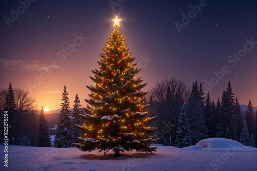 Majestic illuminated Christmas tree standing tall in snowy forest against starry twilight sky