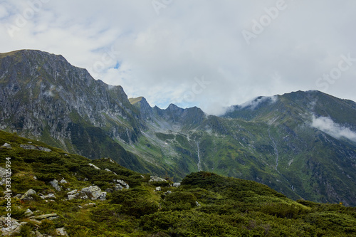 Majestic landscape of summer mountains. View of rocky peaks and coniferous forest hills in fog. Fagaras Mountains.Transylvania. Romania. Wild nature relaxing background.