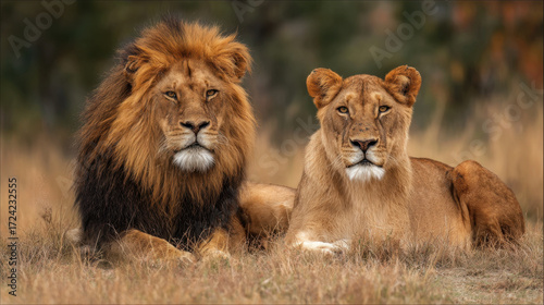 Majestic lion and lioness resting together in golden grassland, displaying their regal manes and serene expressions under soft natural light.