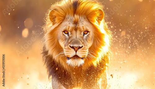 Majestic lion charging forward bathed in golden sunlight dust and particles swirling around it Powerful and intense g