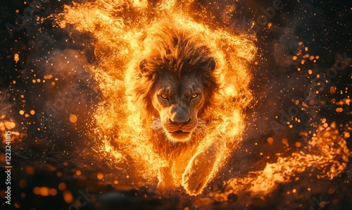 Majestic Lion in Fiery Blaze, Symbol of Strength and Power