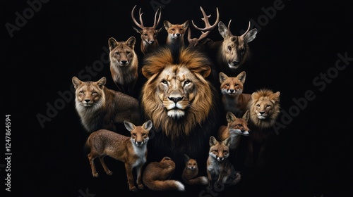 Majestic lion surrounded by various wildlife on black background; nature, wildlife, poster