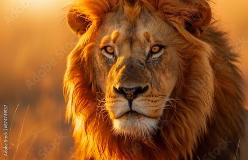 majestic lion, with its golden mane and piercing eyes, stands in the savannah
