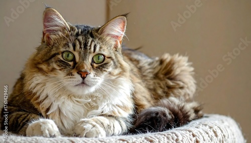 Majestic Maine Coon Cat Resting Indoors with Focused Gaze.