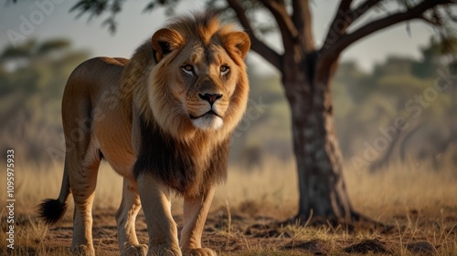 Majestic male lion standing in savanna grassland near a tree at sunrise.