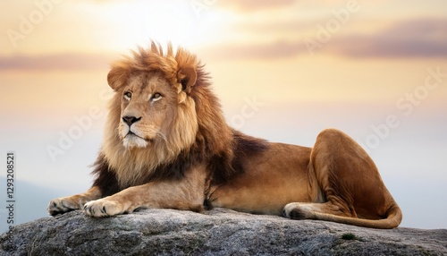Majestic Male Lion Surveying His Territory from Atop a Rocky Outcrop, Basking in the Warmth and Pride of Africas Wild Heart