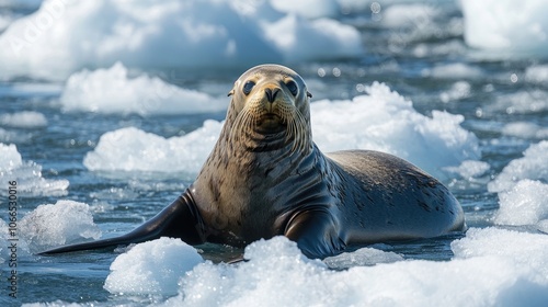 Majestic male Steller sea lion rests on dramatic floating ice, capturing the grandeur of this incredible creature in its natural environment. Ideal for wildlife photography with ample copy space.