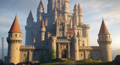 Majestic Medieval Castle with Tall Spires and Stone Walls in Sunset Light