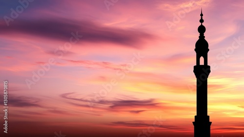 Majestic Minaret Silhouette Against Vibrant Sunset Sky with Cloud Patterns