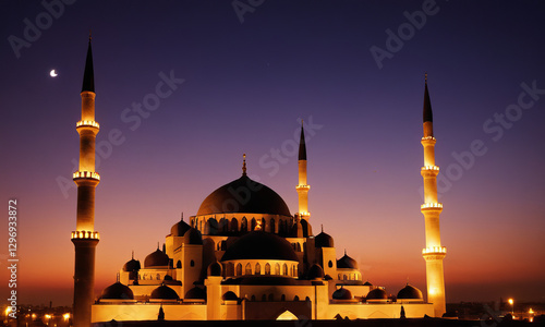 Majestic Mosque at Night, A Stunning Architectural Landmark Illuminated Under the Crescent Moon