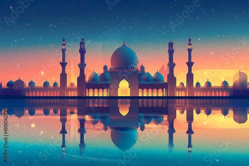 Majestic Mosque Reflecting in Tranquil Waters at Sunset