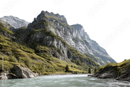 Majestic mountain landscape with lush greenery and flowing river, cut out