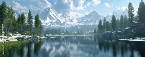 Majestic mountain landscape with snow-capped peaks and tranquil lake
